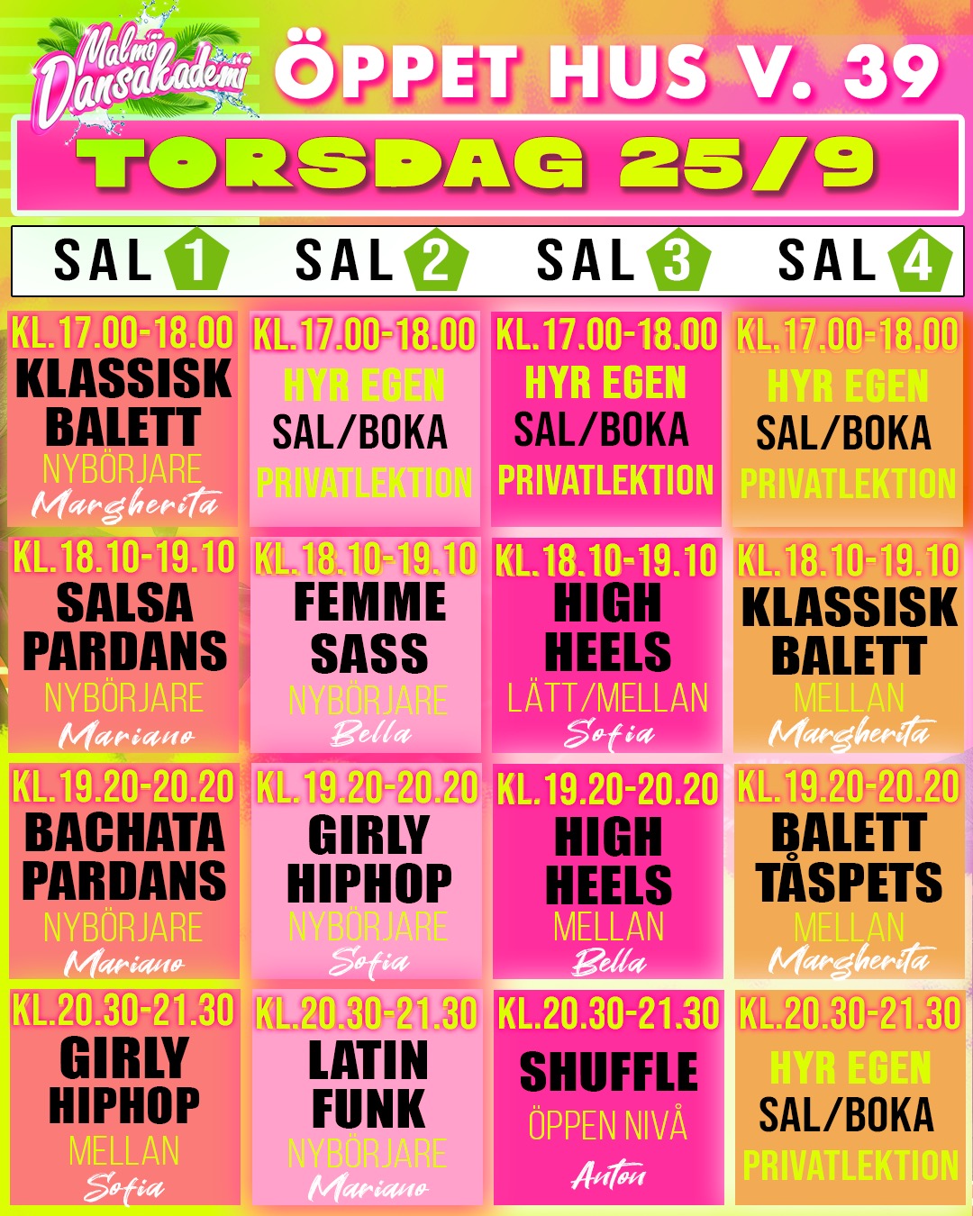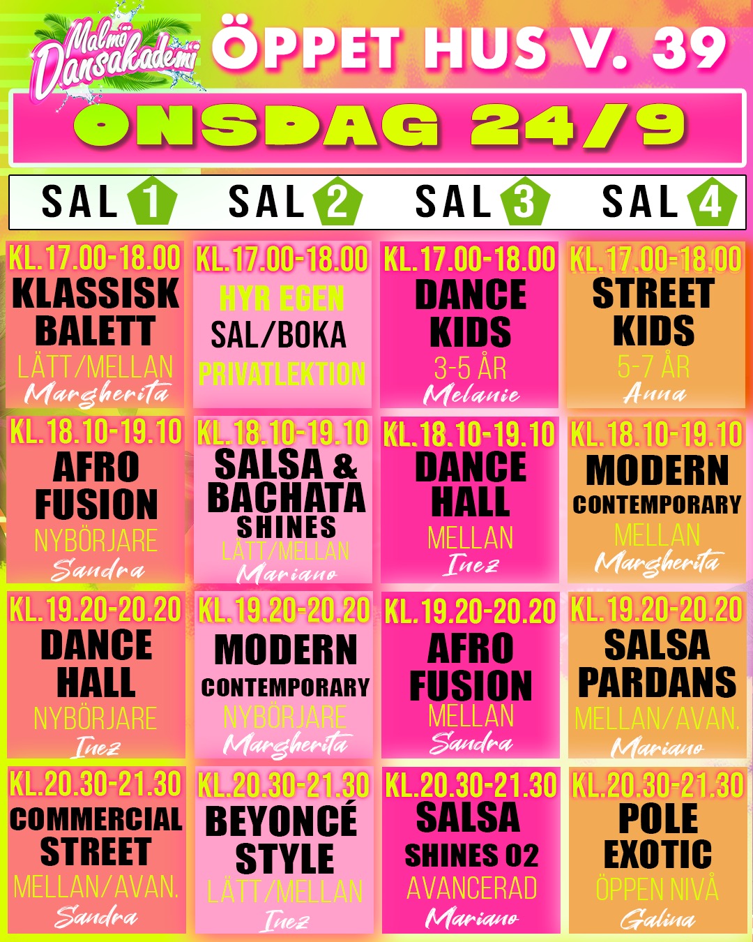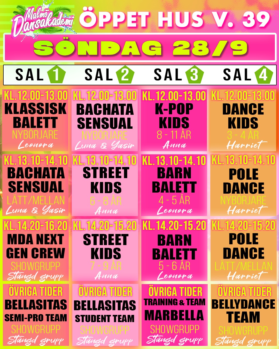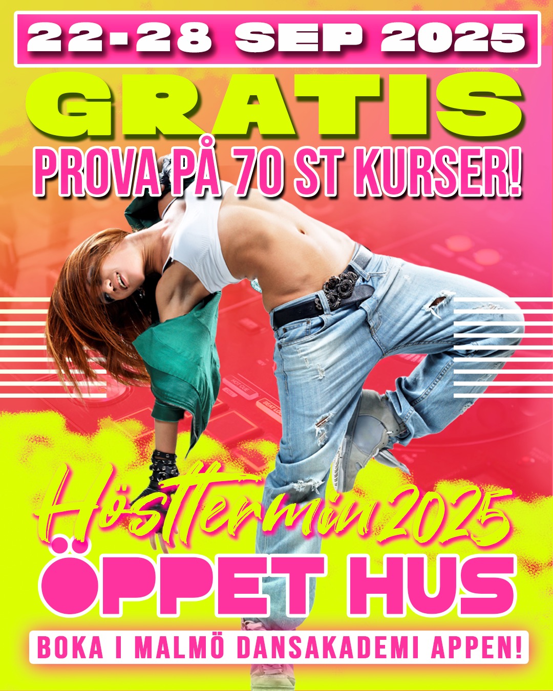Skånes största dansskola: Malmö Dansakademi slår upp sina dörrar för hösttermin 2025! Under första veckan av terminen har vi en gratis öppet hus vecka för alla nya och gamla elever. Då är allmänheten välkomna att prova på alla våra kurser som ej är fullsatta, GRATIS, hela första veckan!